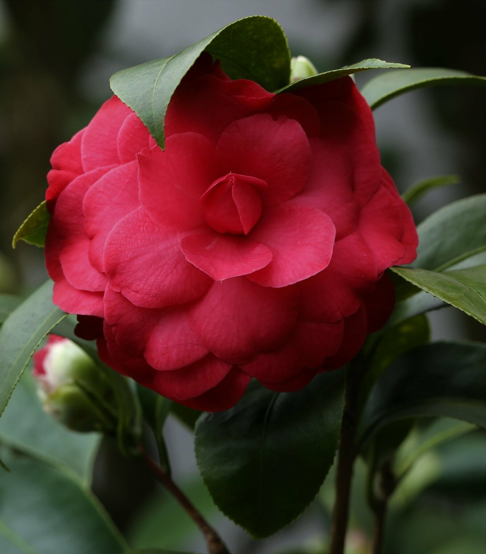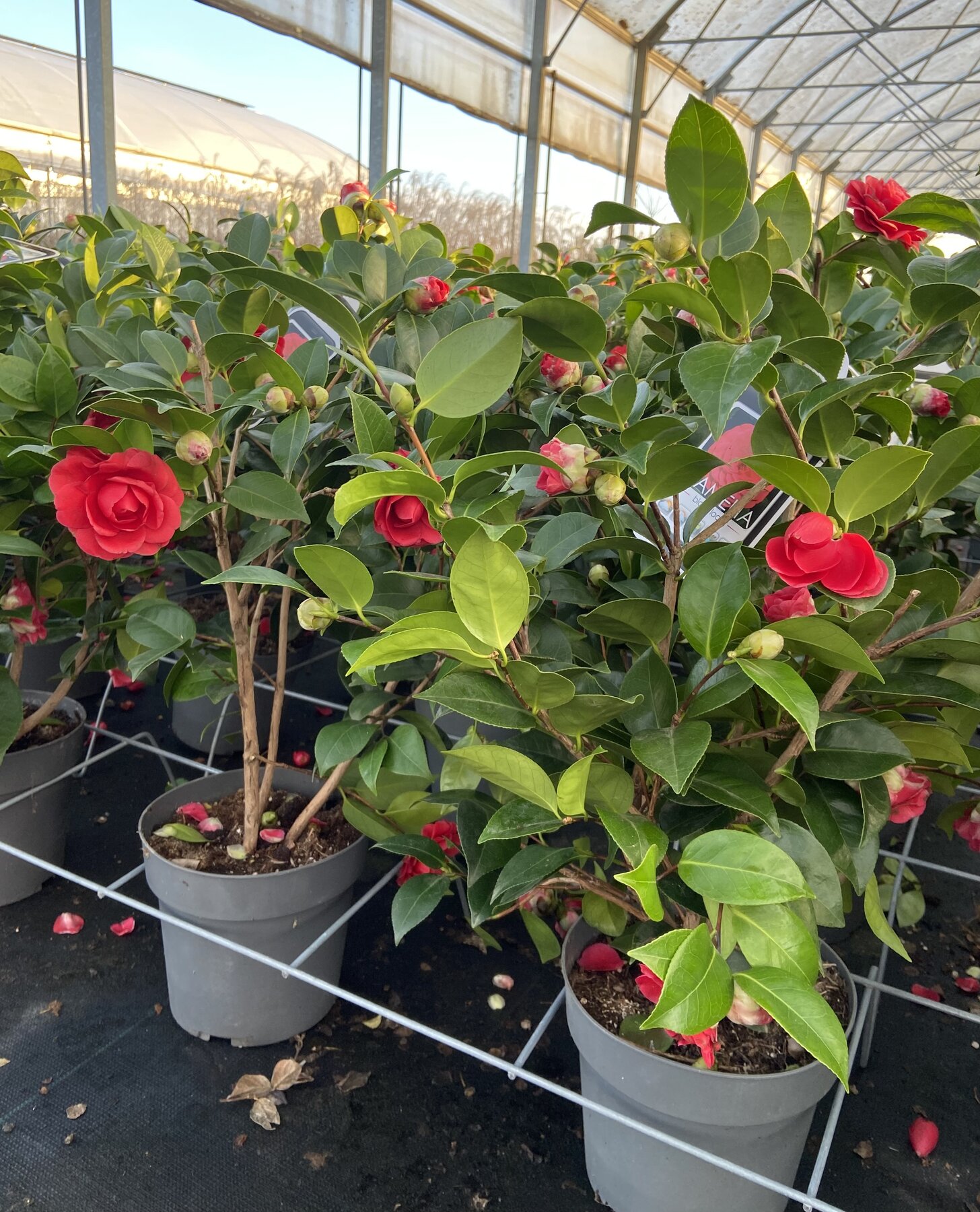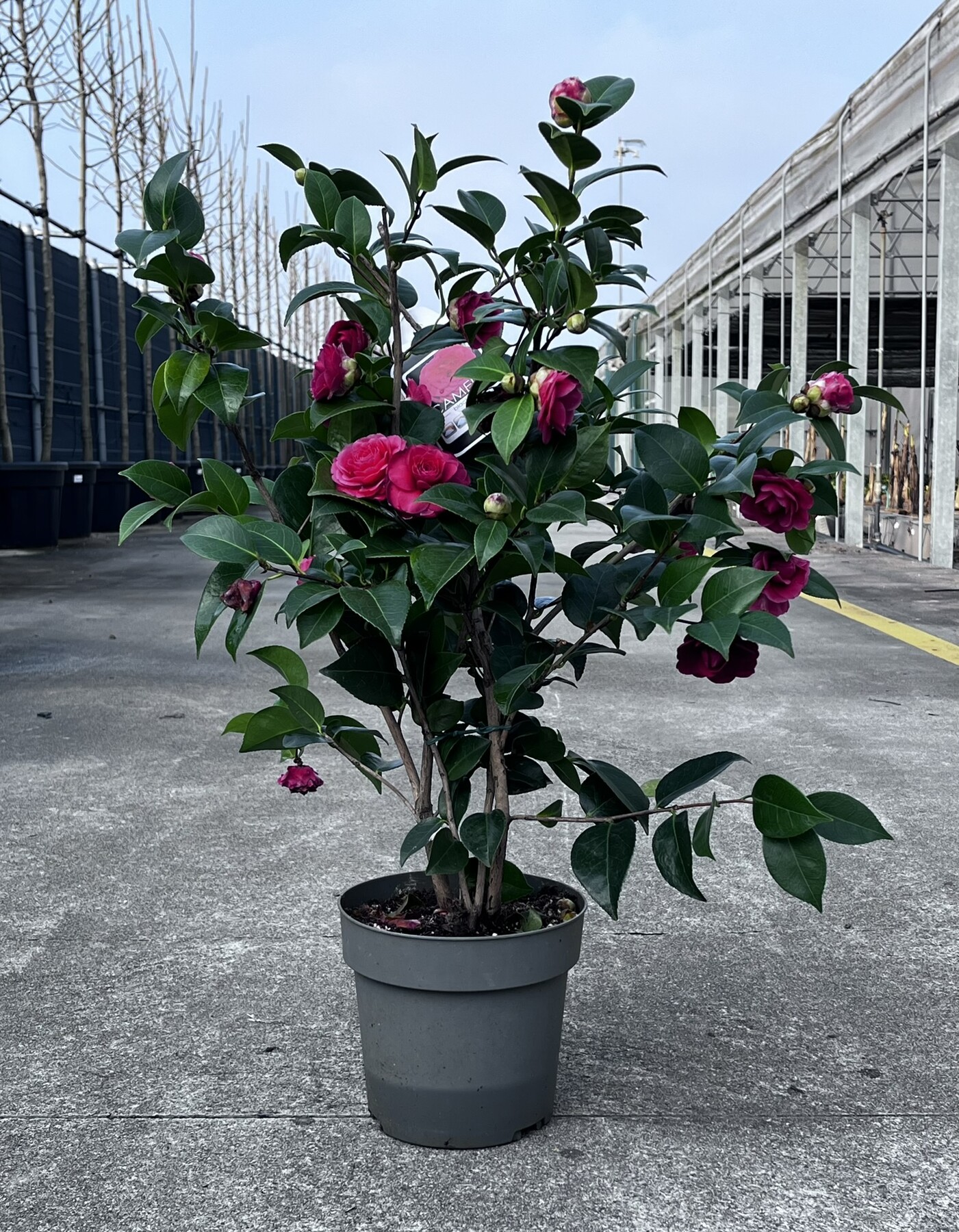 Arbusto sempreverde della famiglia delle Theaceae. Portamento elegante, cespuglioso. Può raggiungere 3 mt di altezza. Foglie ovali acuminate in punta, con lamina coriacea, lucide e di colore verde scuro. Da febbraio a maggio si copre di grandi fiori doppi embricati, perfetti, di color rosso scuro. Predilige un terreno acido e fertile.