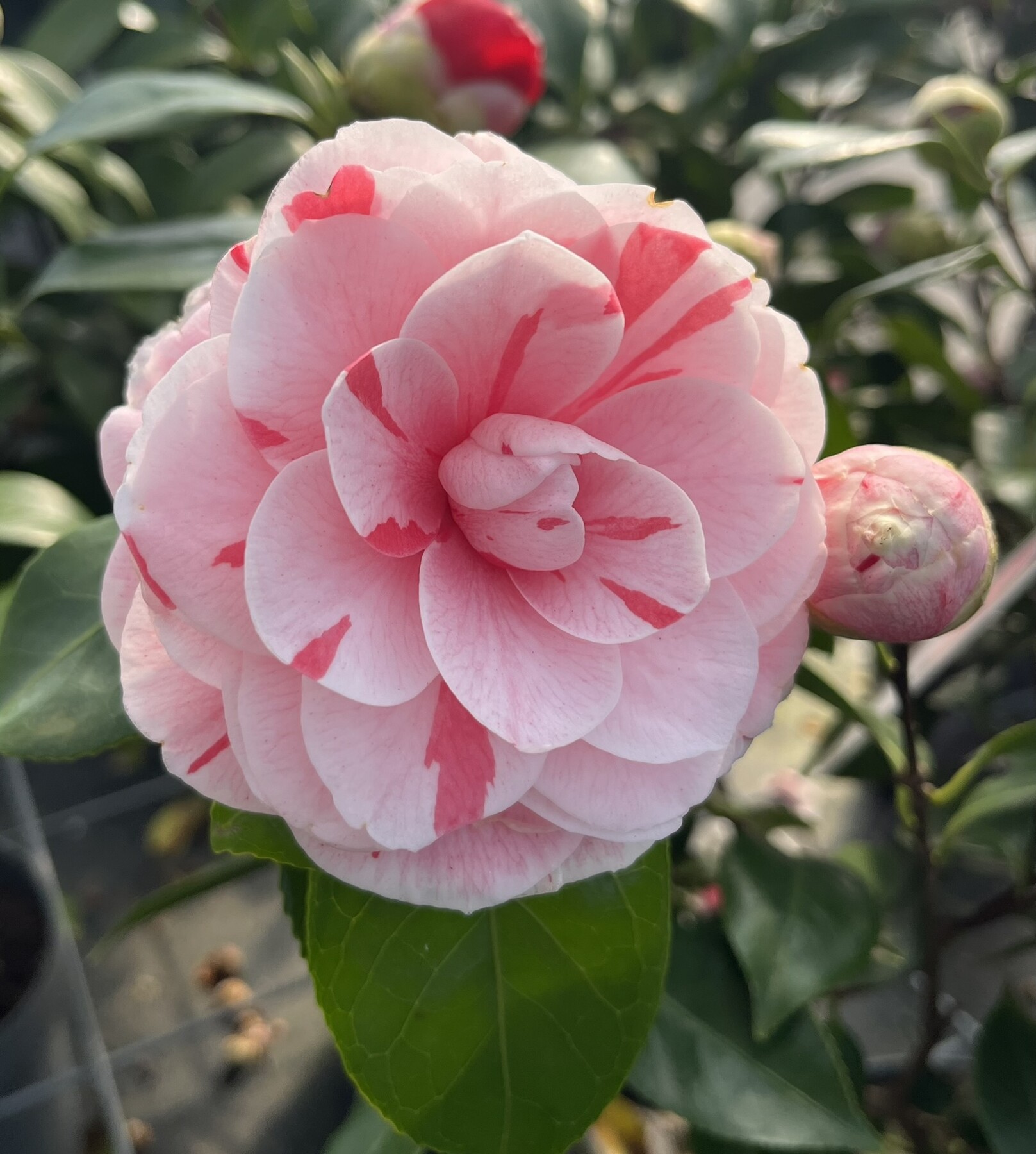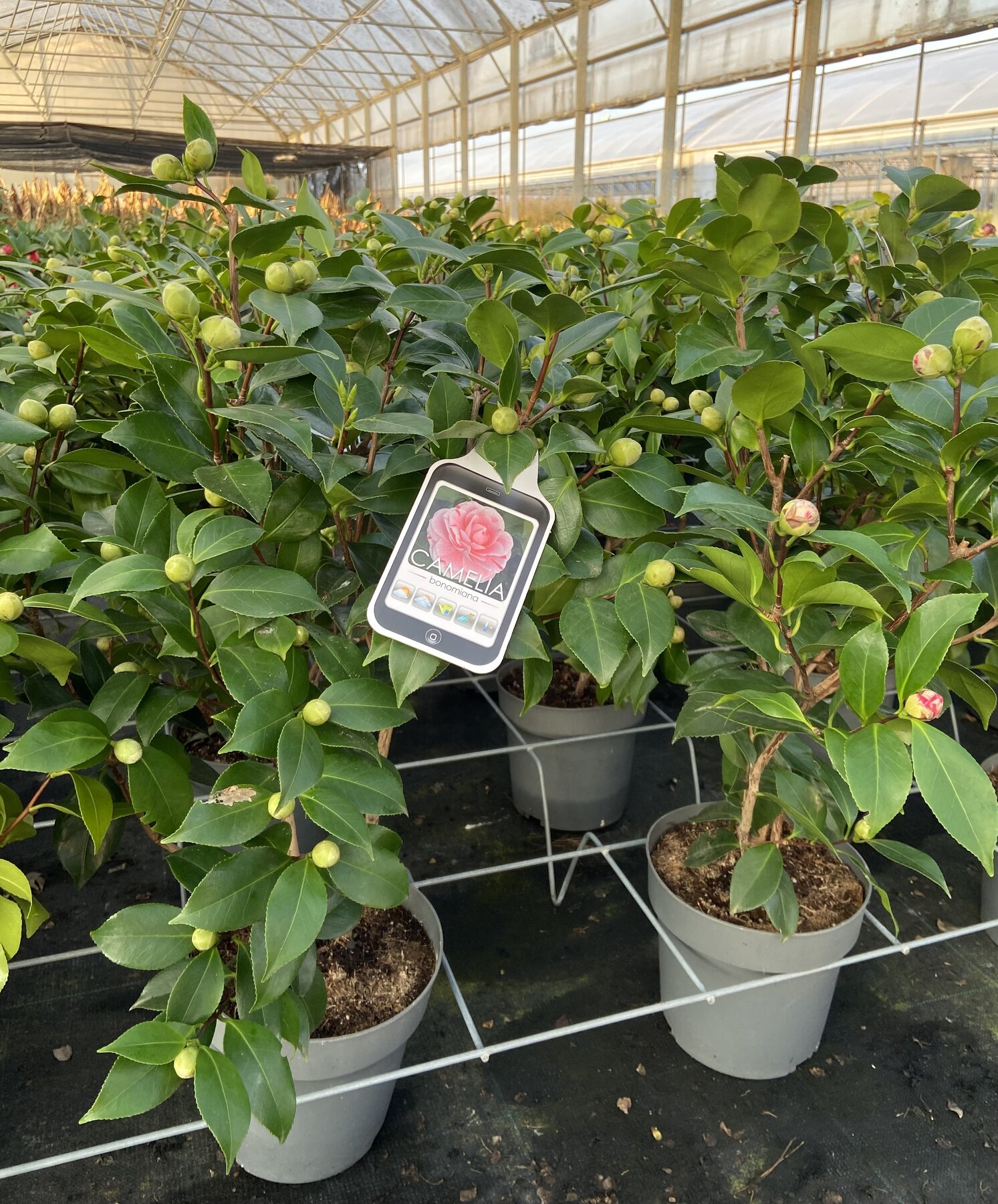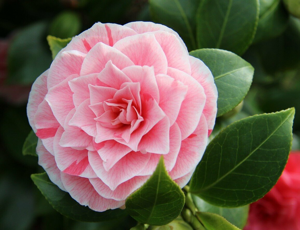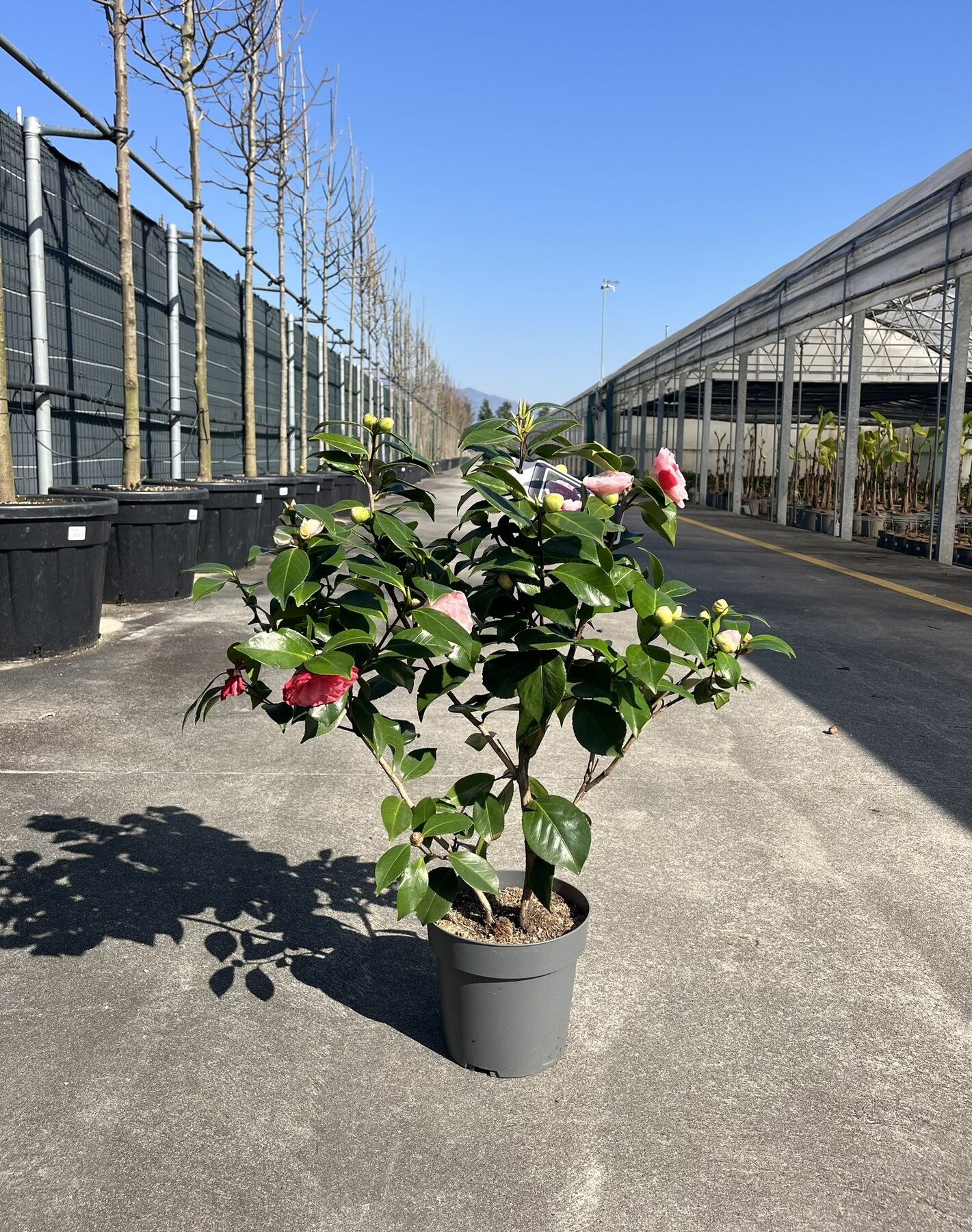 Arbusto sempreverde della famiglia delle Theaceae. Portamento elegante, cespuglioso. Può raggiungere 3 mt di altezza. Foglie ovali acuminate in punta, con lamina coriacea, lucide e di colore verde scuro. Da febbraio a maggio si copre di grandi fiori doppi a rosetta, con petali rosa striati di rosso sangue. Predilige un terreno acido e fertile.