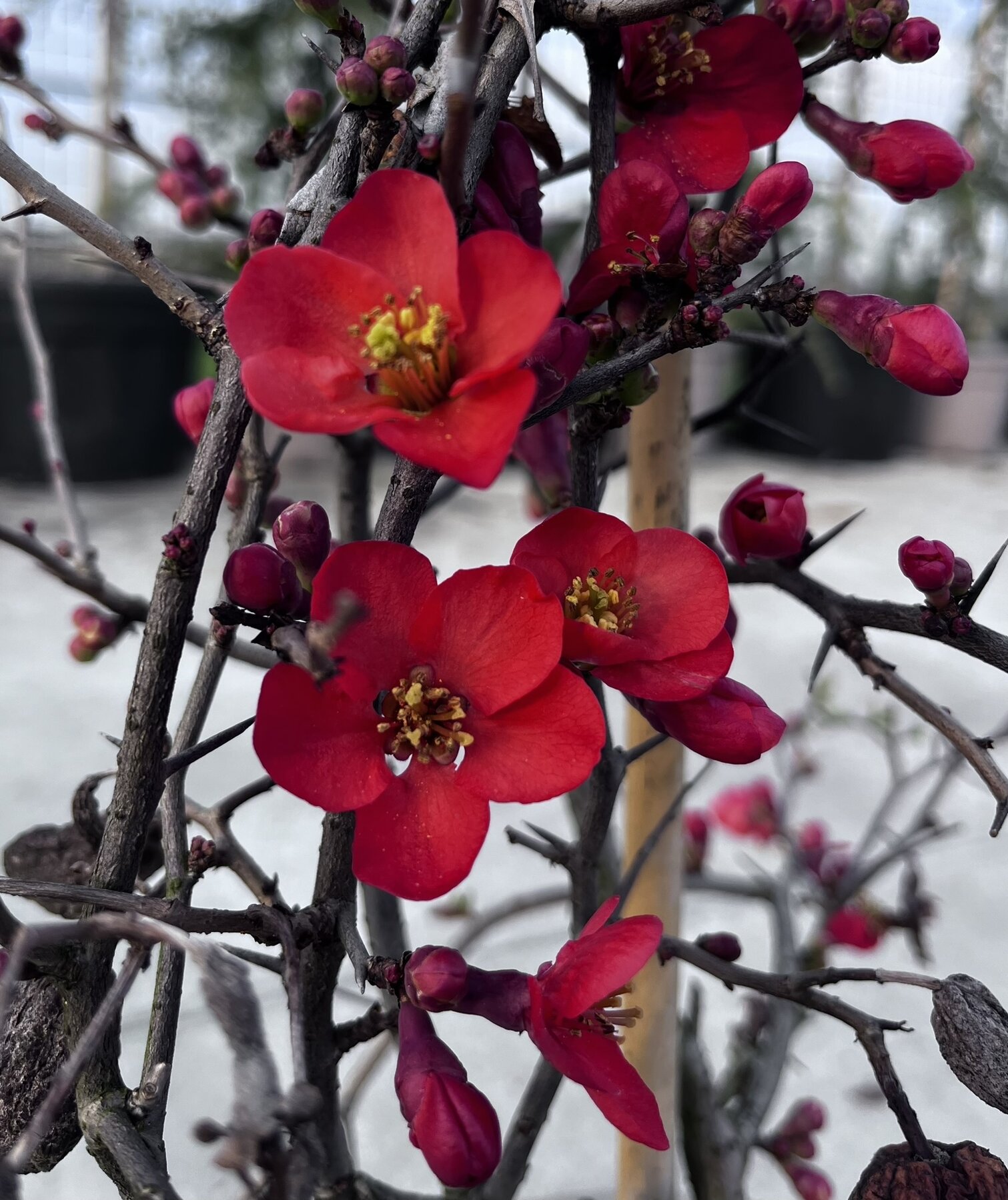 Arbusto a foglia caduca appartenente alla famiglia delle Rosaceae. Portamento cespuglioso, eretto, arrotondato, può raggiungere i 120 cm di altezza. Fogliolina verde lucente. Fiore rosso vivo a forma di coppa, da marzo ad aprile. Frutti verdi, gialli a maturità, simile a mele cotogne. E' tra i primi arbusti a fiorire. Ama il terreno acido e argilloso.