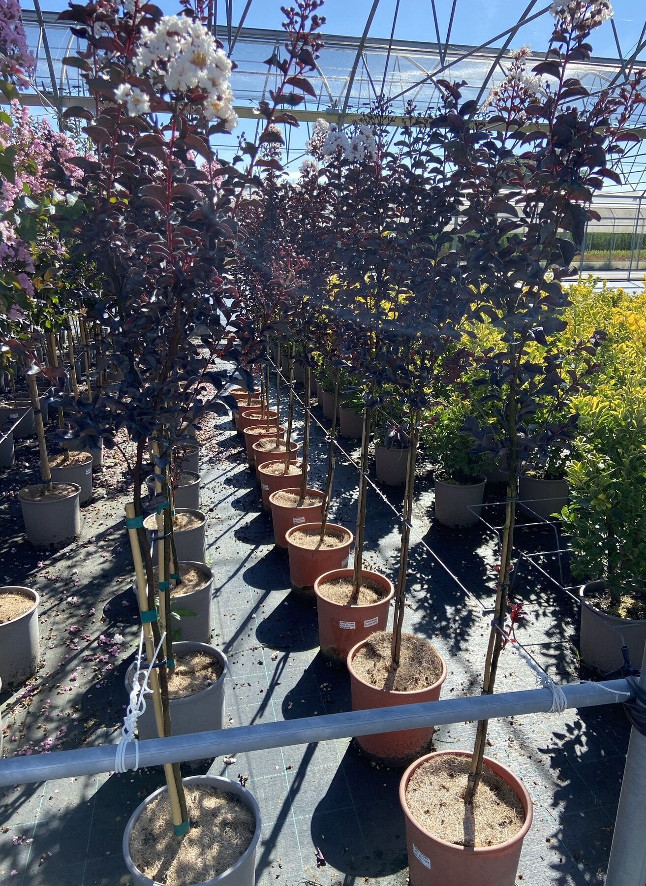 Albero a foglia caduca della famiglia delle Lythraceae. Portamento eretto con tronco unico e chioma tondeggiante, allargata all'apice. Raggiunge i 120-130 cm di altezza. Caratteristico fogliame rosso scuro / viola. Fiori crespi a pannocchie compatte fitte e lunghe di colore bianco. Ideale per macchie di colore isolate. Predilige un terreno fertile e ben drenato.