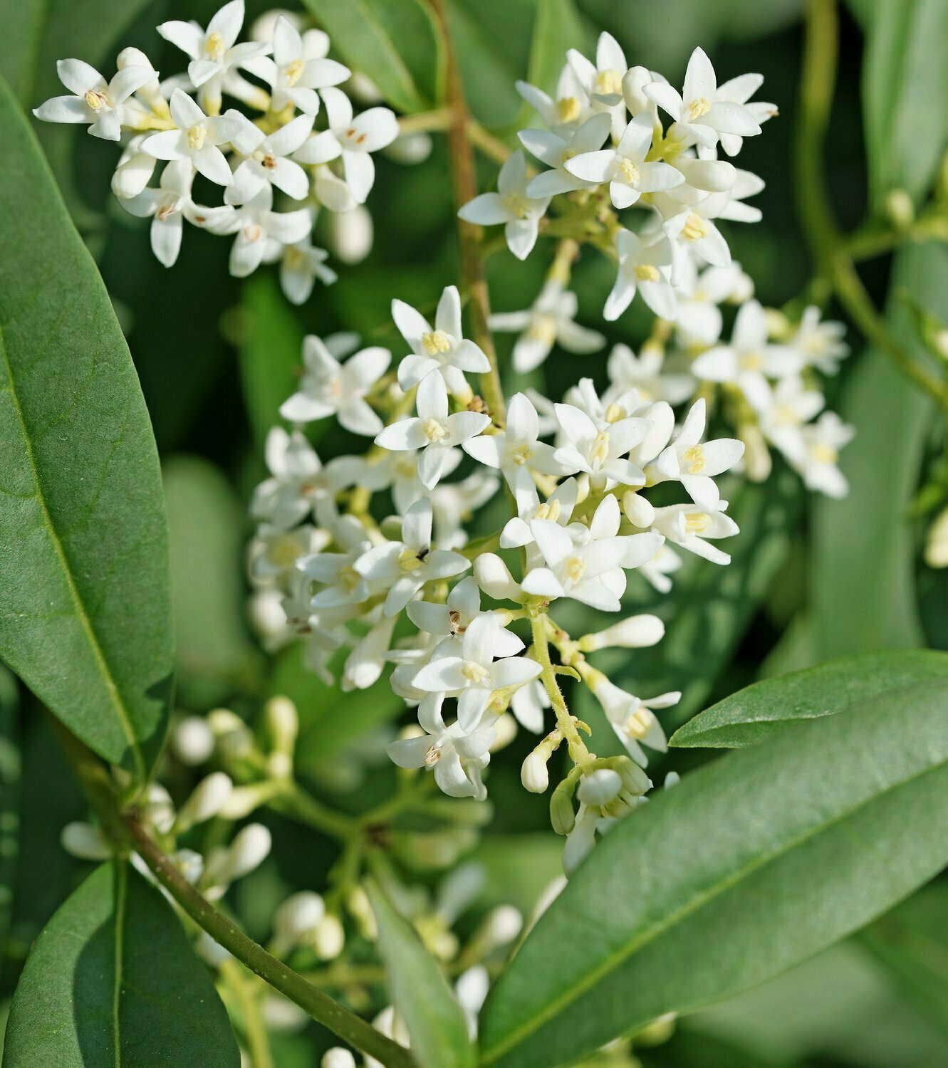 Albero sempreverde appartenente alla famiglia delle Oleaceae. Portamento ad alberello alto-fusto con tronco spoglio alto 200-220 cm con chioma tondeggiante. Foglie coriacee, lucide, di colore verde bottiglia. Fiori piccoli ma profumati in estate, a cui seguono bacche nere in autunno. Ideale per siepe e bordure. Predilige un terreno fertile e ben drenato.