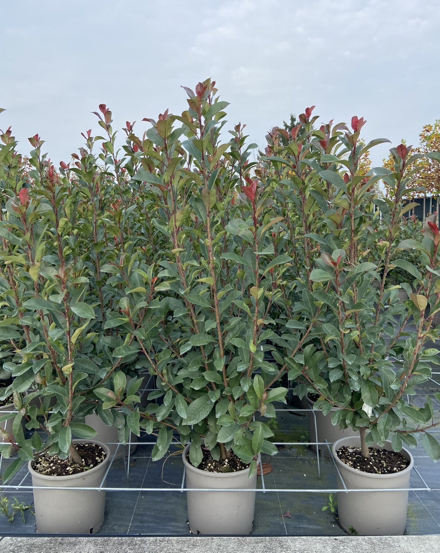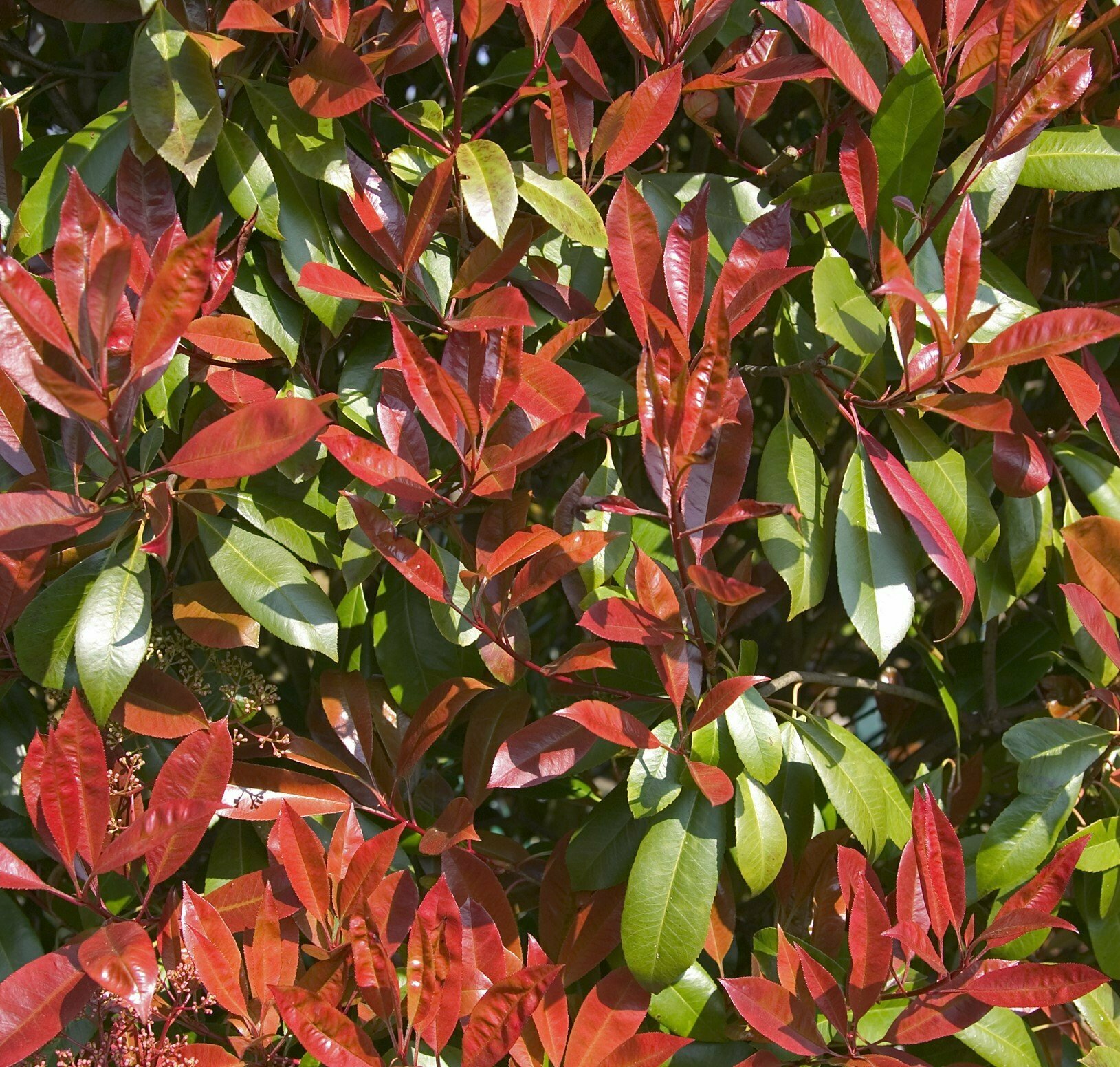 Arbusto sempreverde appartenente alla famiglia delle Rosaceae. L'aspetto è arbustivo, compatto, eretto, la crescita è veloce. Raggiunge un'altezza di 6 mt. Il fogliame, lucido, è verde in estate ed inverno. La nuova vegetazione, in primavera ed autunno è di uno splendido rosso intenso e brillante. I fiori, a fine primavera, sono bianchi e piccoli riuniti in grandi infiorescenze. Ideale per siepe ma utilizzato anche come pianta singola o in un bordo misto. Terreno drenato.