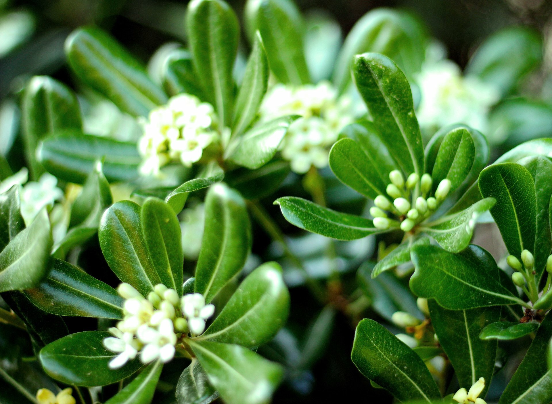 Arbusto sempreverde appartenente alla famiglia delle Pittosporaceae. Portamento eretto, compatto a lenta crescita. Raggiunge i 3 mt di altezza. Foglie spatolate, di colore verde scuro con una vistosa venatura chiara al centro. Fiori piccoli carnosi di colore bianco che divengono successivamente crema, ma sempre molto profumati. Predilige un terreno fertile e ben drenato.