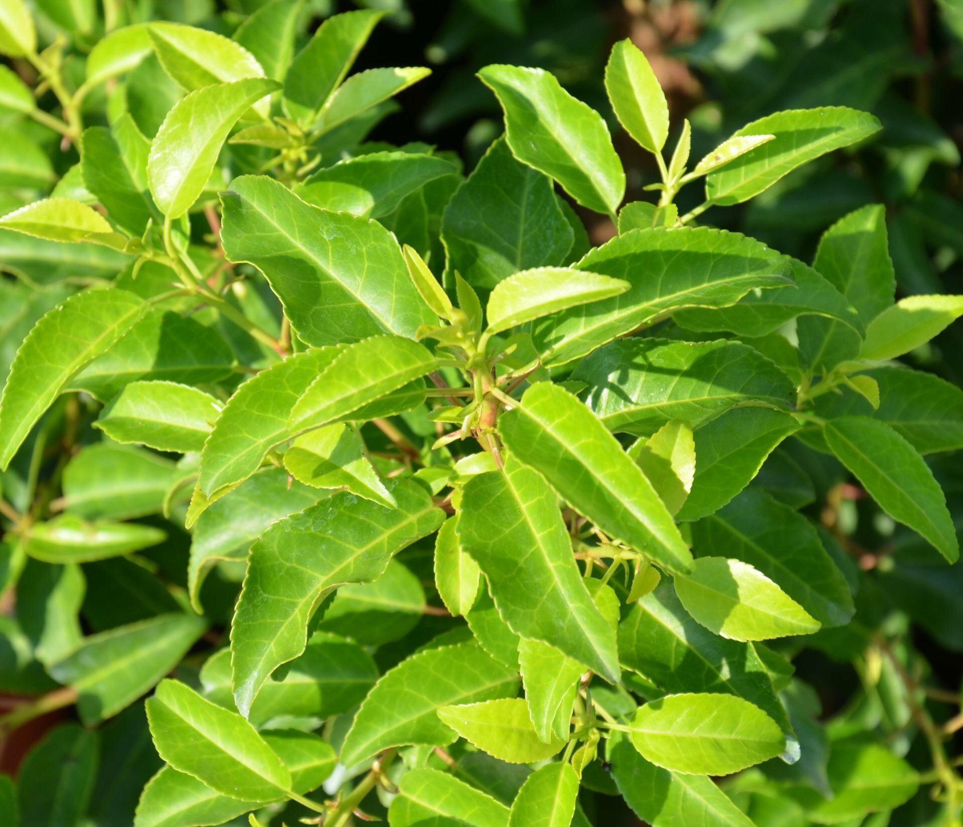 Arbusto sempreverde appartenente alla famiglia delle Rosaceae. Portamento eretto, cespuglioso, ramificato. Raggiunge i 3 mt di altezza. Foglie verde scuro dai bordi dentati. Fiori bianchi profumati in primavera, piccioli rossi delle foglie e giovani rami rossi. Dai molteplici utilizzi. Predilige un terreno fertile e ben drenato.