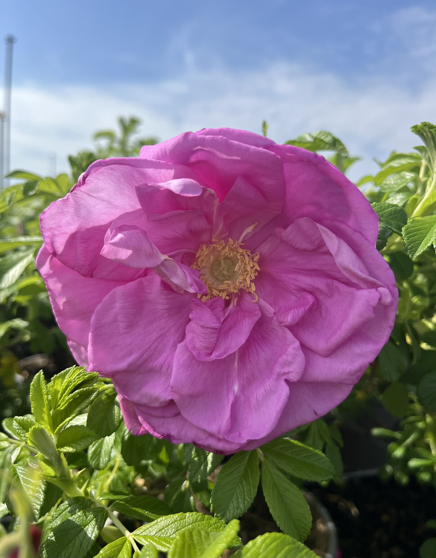 Rosa a foglia caduca della famiglia delle Rosaceae. Portamento eretto, cespuglioso, spinoso. Raggiunge i 70/100 cm di altezza. Foglie verdi con venature rugose e margine seghettato. Fiori rosa carico, semplici, molto profumati, grandi, seguiti da frutti rosso pomodoro. Rifiorente. Terreno possibilmente un po' acido, molto fertile e ben drenato.