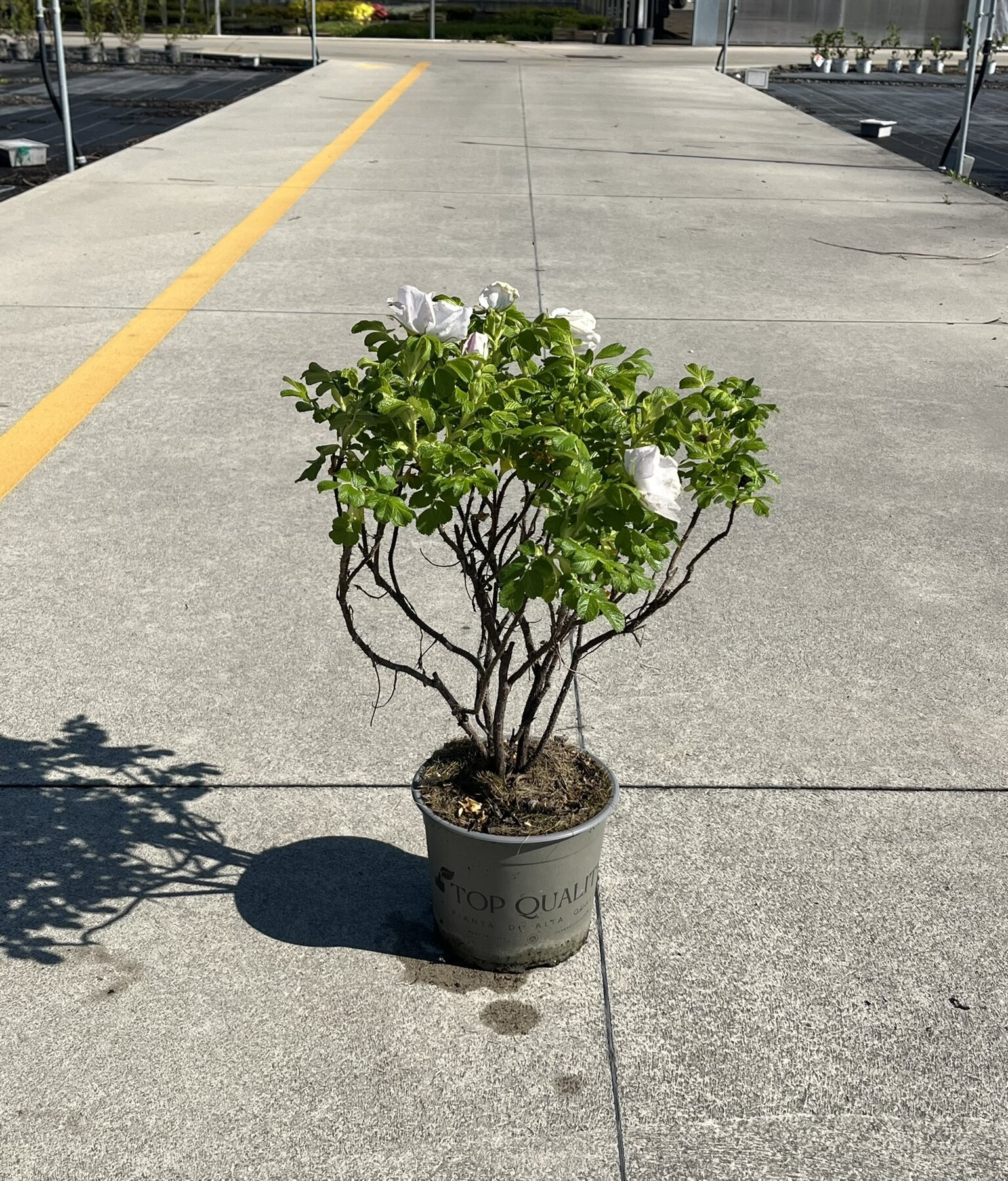 Rosa a foglia caduca della famiglia delle Rosaceae. Portamento eretto, cespuglioso, spinoso. Raggiunge il 170/200 cm di altezza. Foglie verdi con venature rugose e margine seghettato. Fiori bianchi, semplici, molto profumati, grandi, seguiti da frutti rosso pomodoro. Rifiorente. Terreno possibilmente un po' acido, molto fertile e ben drenato.